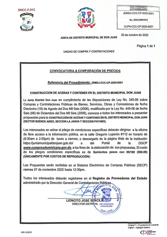 La Junta Municipal Don Juan, en cumplimiento de las disposiciones legales vigentes y con el objetivo de promover la transparencia y eficiencia en el uso de los recursos públicos, convoca a empresas constructoras, contratistas y proveedores, calificados a presentar sus propuestas para la comparación de precios correspondiente a la obra de construcción de aceras y contenes en diversas áreas del Distrito Municipal Don Juan.